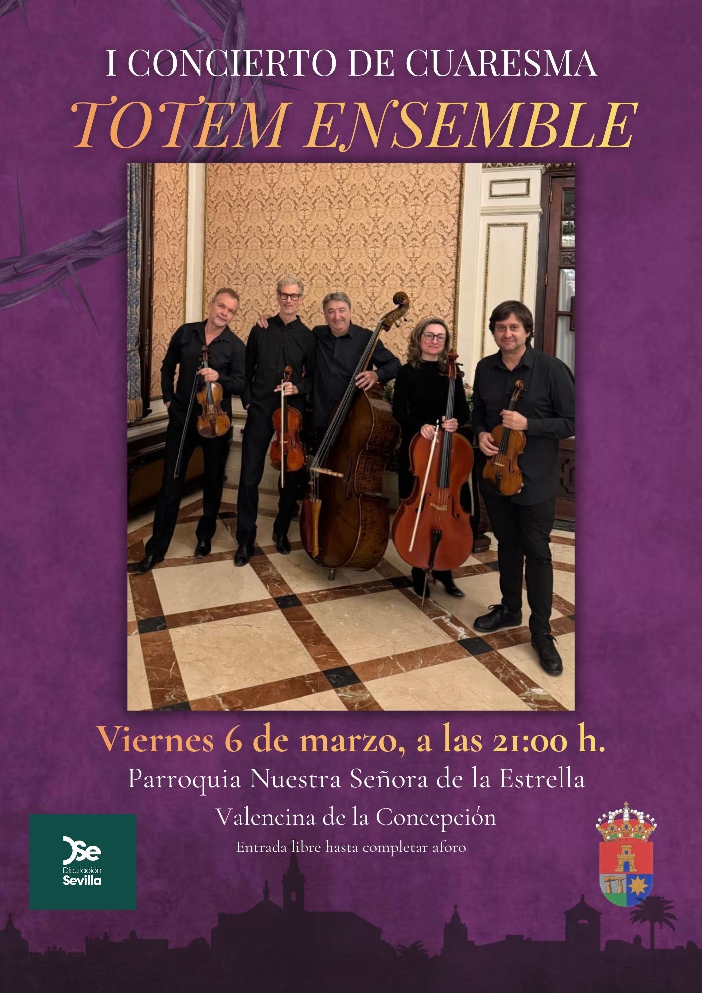 La delegaciones de Cultura y de Festejos y Tradiciones del Ayuntamiento de Valencina de la Concepción, con la participación de la Diputación de Sevilla, organizan un concierto del afamado quinteto de cuerdas Totem Ensemble, que nos interpretará un repertorio de conocidísimas marchas procesionales con arreglos propios especialmente diseñados para quinteto de cuerda, durante el concierto podremos oír marchas como “Macarena” de Manuel Cebrián, “Virgen del Valle” de Vicente Zarzuela o “La Madrugá” de Abel Moreno, entre otras.