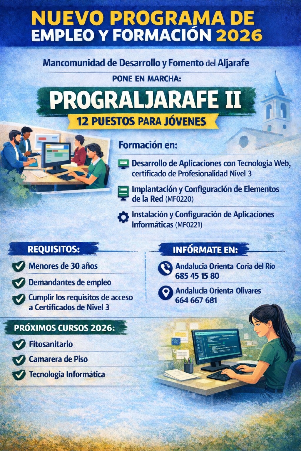 ¿Buscas una oportunidad real para formarte y trabajar en el sector tecnológico? La Mancomunidad del Aljarafe pone en marcha el nuevo programa Prograljarafe II, diseñado específicamente para jóvenes menores de 30 años, demandantes de empleo y que cumplan los requisitos de acceso a Certificados Nivel 3.