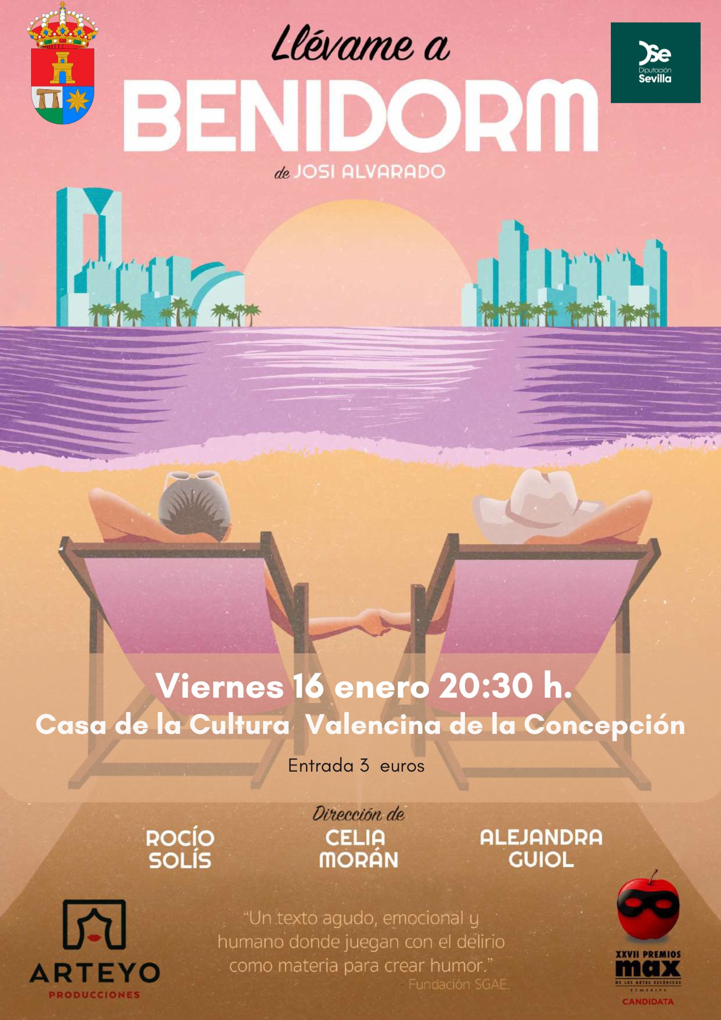 El próximo viernes 16 de enero a las 20:30 h. en el Salón de Actos de la Casa de la Cultura podremos ver cómo Mila y Luisa deciden escaparse de la residencia de ancianos y se embarcan en un viaje a Benidorm, ‘El paraíso de los viejos’.