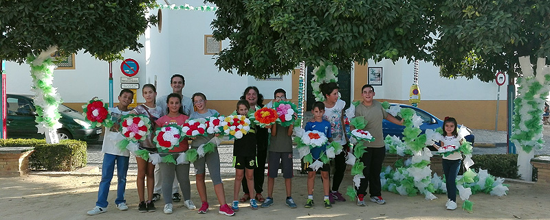 Para la decoración de la Plaza Nuestra señora de la Estrella, el Grupo Joven de la Hermandad de Torrijos ha contado este año con la colaboración de l os miembros del Proyecto Ribete y del Taller de Manualidades y Costumbres Populares del programa de Participación y Dinamización de Adultos de la delegación de Igualdad y Bienestar Social para elaborar y colocar parte de los adornos y guirnaldas.