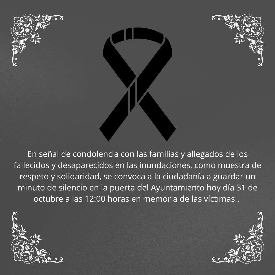 En señal de condolencia con las familias y allegados de los fallecidos y desaparecidos en las recientes inundaciones, el Ayuntamiento de Valencina de la Concepción convoca a la ciudadanía a guardar un minuto de silencio hoy, 31 de octubre, a las 12:00 horas en la puerta del Ayuntamiento.