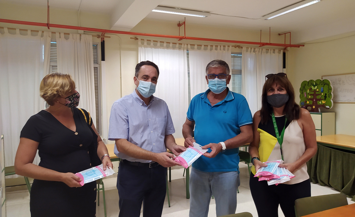El alcalde de Valencina, acompañado de las cocejalas-delegadas de Obras y Servicios, Bienestar Social y Educación, ha entregado en la mañana de hoy un total de 1.500 mascarillas infantiles a la Dirección del CEIP El Algarrobillo, el cual se encargará de repartirlas entre todo el alumnado del centro escolar.