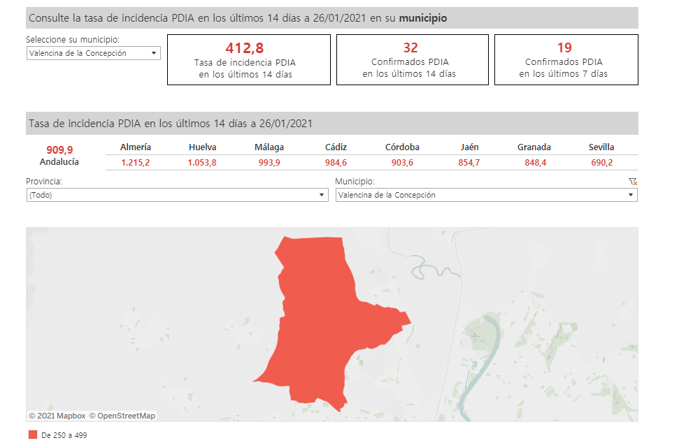 Valencina cuenta hoy con 32 casos (-3 respecto a ayer lunes) y una tasa de 412,8 positivos por cada 100.000 habitantes, según datos actualizados hoy martes por la Junta de Andalucía.