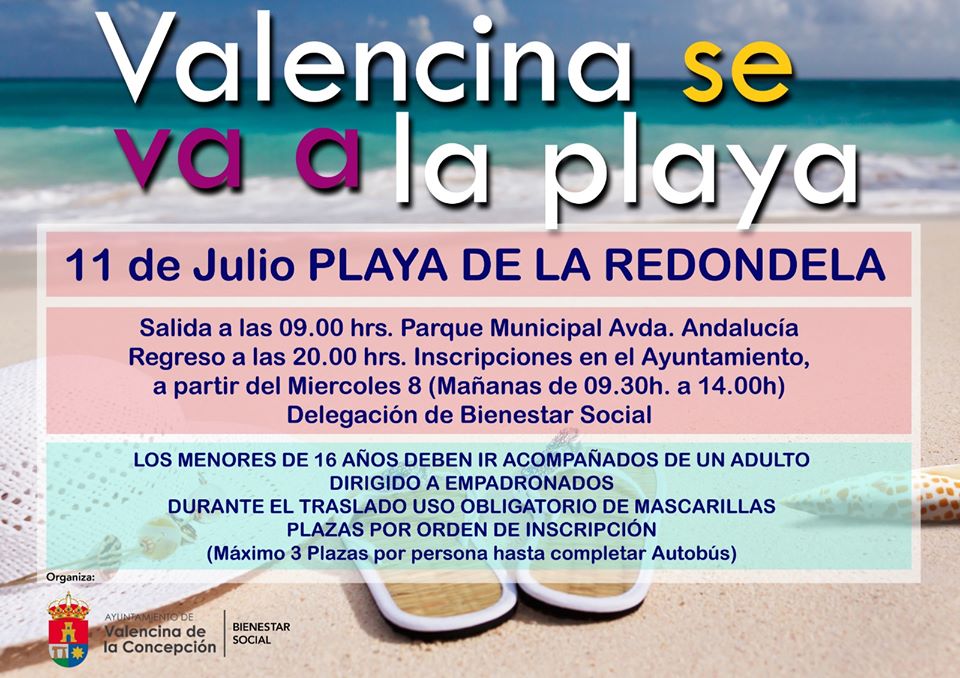 El Ayuntamiento de Valencina, a través de la delegación municipal de Bienestar Social, ha añadido a su programación estival de actividades lúdicas una excursión a la Playa de la Redondela (Huelva). Tendrá lugar el próximo sábado 11 de julio y es una actividad dirigida a personas empadronadas en Valencina.