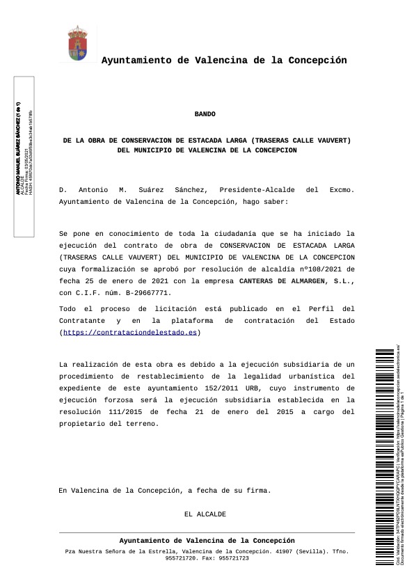 El Ayuntamiento de Valencina ha publicado un Bando para informar a la ciudadanía en general y, particularmente, a los vecinos/as afectados por las obras de conservación en la Estacada Larga (traseras de la calle Vauvert). La realización de estas obras se debe a la ejecución subsidaria de un procedimiento que busca restablecer la legalidad urbanística de este entorno.