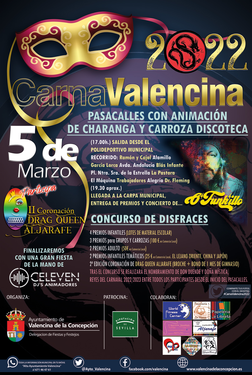 La delegación de Fiestas y Festejos del Ayuntamiento de Valencina en colaboración con otras de delegaciones municipales, organiza el próximo 5 de marzo la esperada celebración del Carnaval 2022.