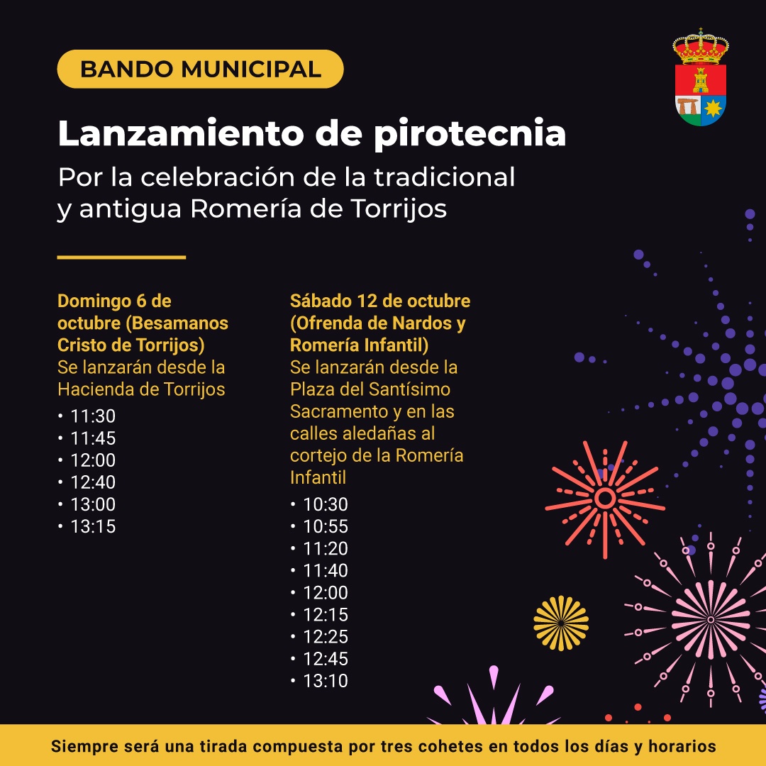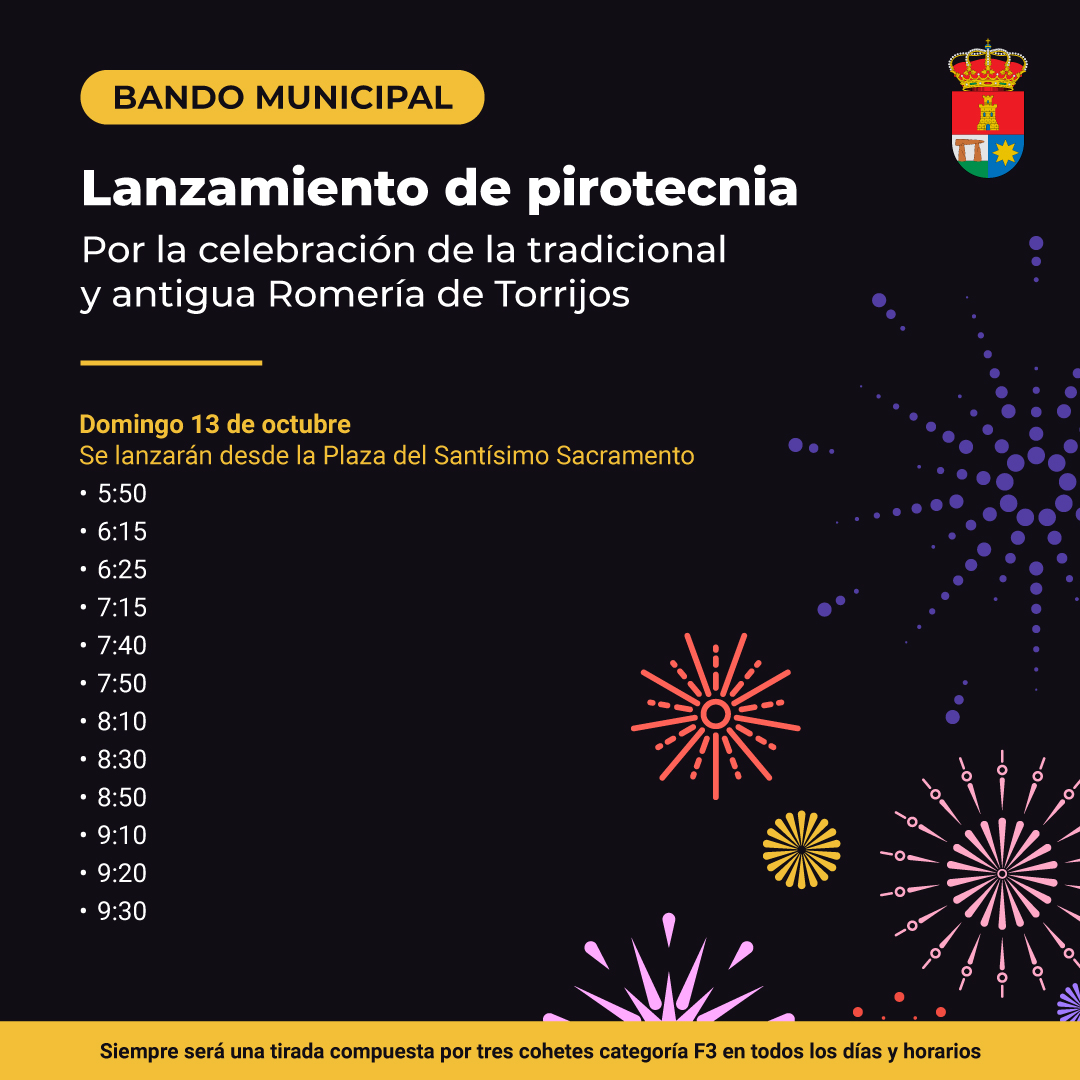 Siguiendo la ordenanza municipal reguladora de la manipulación y uso de artificios pirotécnicos y de realización de espectáculos públicos de fuegos artificiales, informamos que con motivo de la celebración de la tradicional y antigua Romería de Torrijos, organizada por la Real Hermandad del Stmo. Cristo de Torrijos, Ntra. Sra. de la Estrella Coronada y Sta. Ángela de la Cruz, durante los días 6, 12 y 13 de octubre, se procederá al lanzamiento de cohetes.