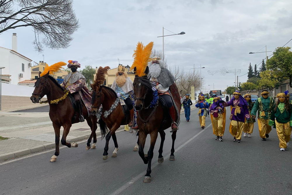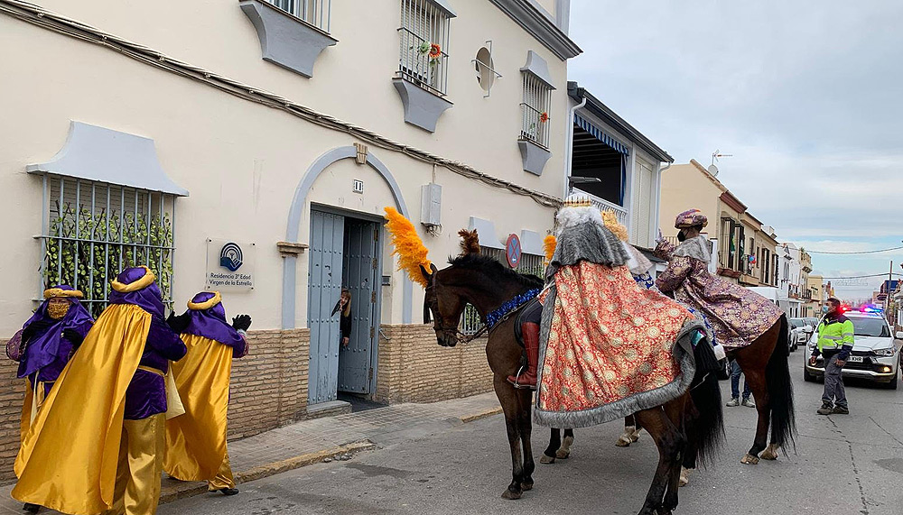 Antes del acto en el campamento, los Reyes Magos realizaron un recorrido a caballo por las calles de Valencina, deteniéndose en la Residencia de Mayores para saludarles, siempre con las debidas medidas de distancia y seguridad. La visita a la Residencia fue un momento muy emotivo para todas las personas asistentes, incluidos los propios Reyes.