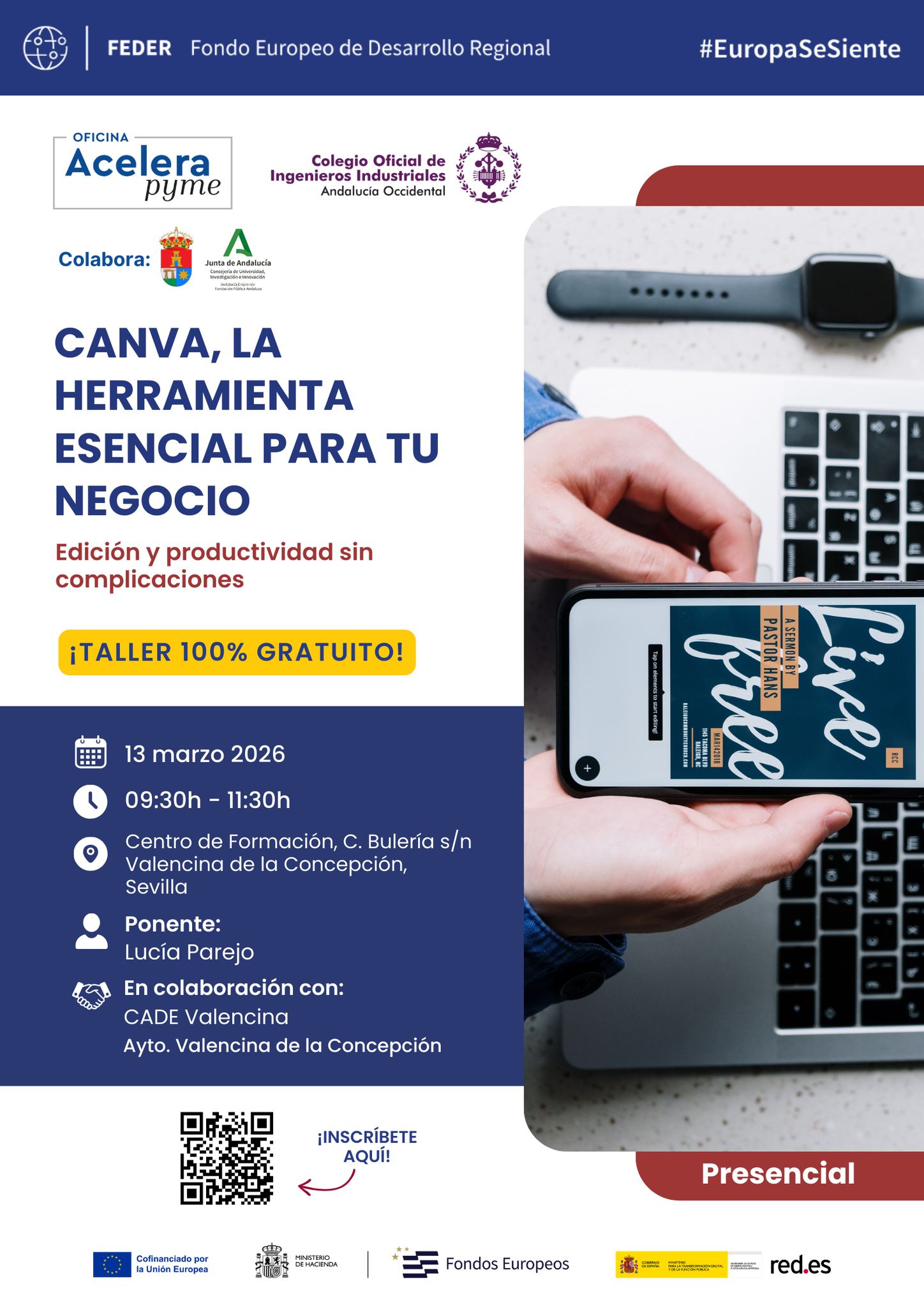 Desde la Oficina Acelera Pyme y en colaboración con el Ayuntamiento de Valencina de la Concepción y el CADE, te invitamos a este taller práctico donde aprenderás a diseñar de forma profesional sin complicaciones.