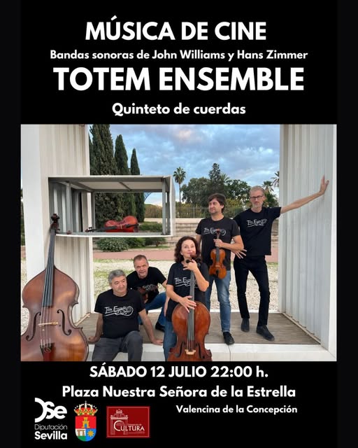 La Delegación de Cultura del Ayuntamiento de Valencina de la Concepción, con la participación de la Diputación de Sevilla, organiza un concierto del afamado quinteto de cuerdas Totem Ensemble, que nos interpretará un repertorio de conocidísimas bandas sonoras de cine titulado “Bandas Sonoras de John Williams y Hans Zimmer”.