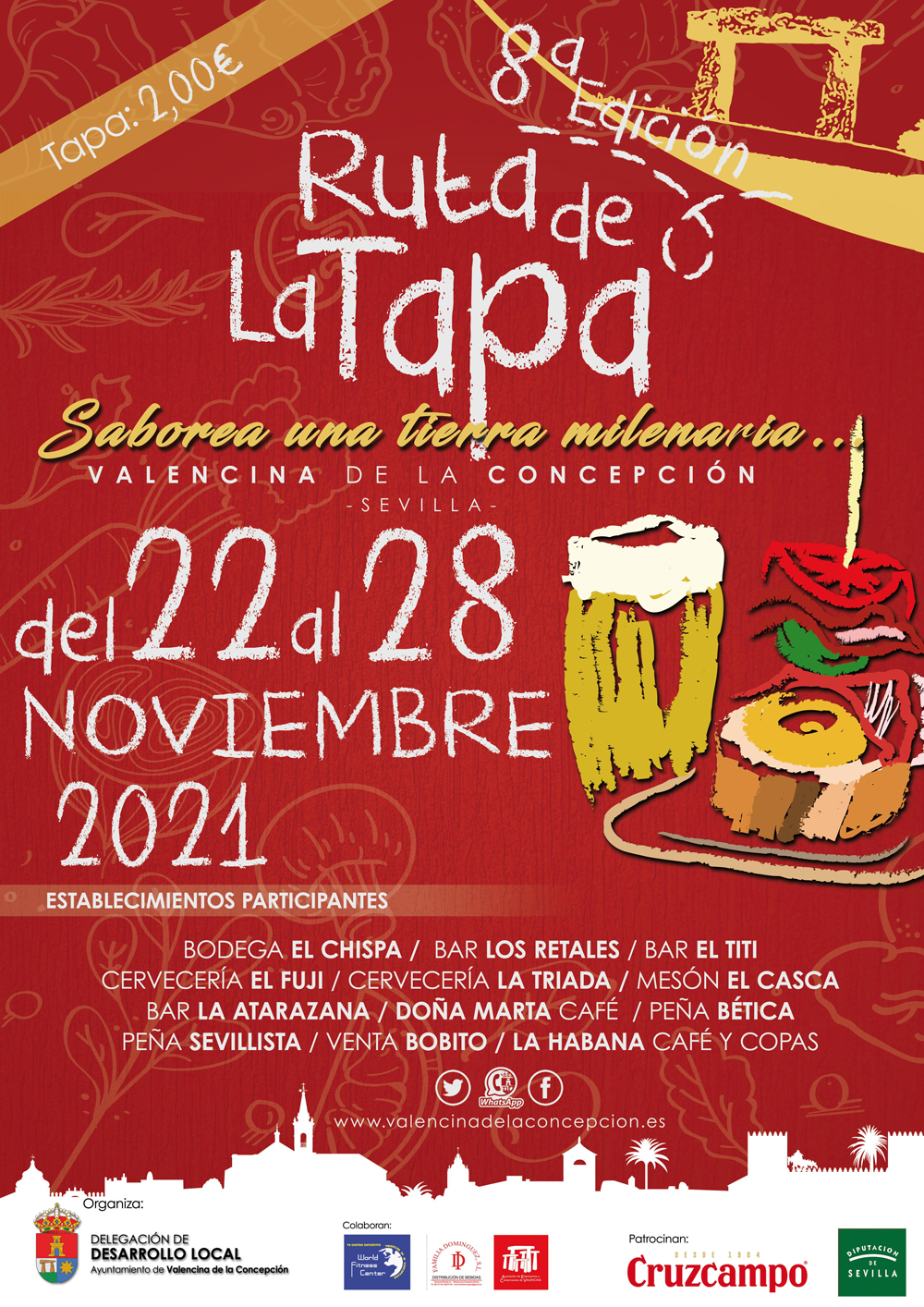 Del 22 al 28 de noviembre, celebramos la VIII edición de la Ruta de la Tapa de Valencina. Esta Ruta Gastronómica, completamente consolidada después de siete ediciones, supone una gran oportunidad para la promoción de la gastronomía local y para dar a conocer la diversidad y calidad de los productos gastronómicos locales.