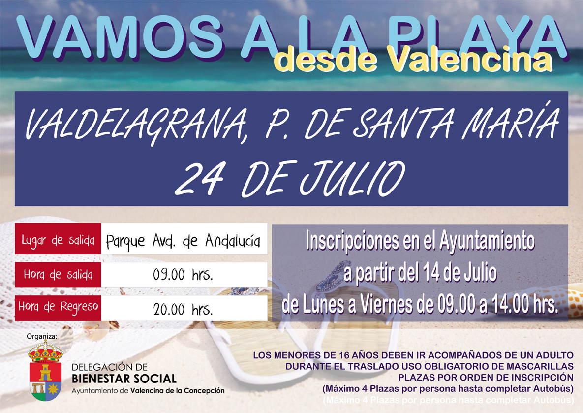El Ayuntamiento de Valencina, a través de la Delegación de Bienestar Social, vuelve a ofrecer la posibilidad de disfrutar de una jornada de playa a aquellas personas que se inscriban en la actividad “Vamos a la playa desde Valencina”.