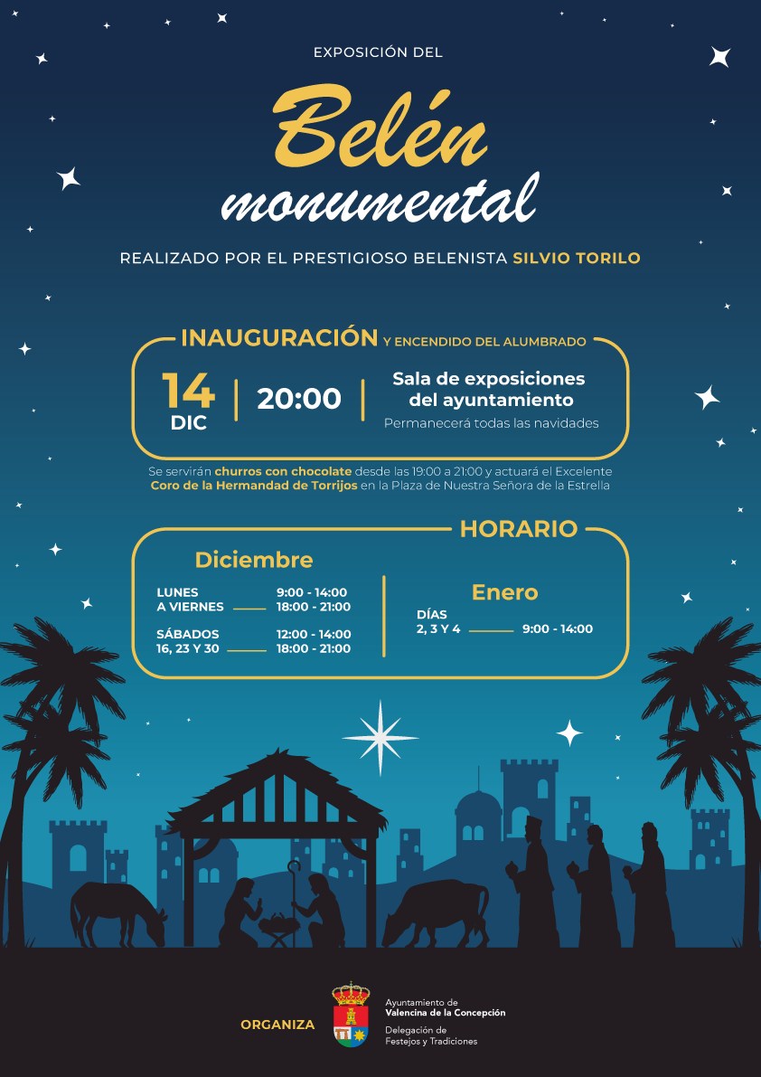 Además, desde las 19:00 hasta las 21:00, podrás disfrutar de unos deliciosos churros con chocolate que endulzarán aún más tu visita al Belén Monumental. Y para hacer aún más especial la noche, el Excelente Coro de la Hermandad de Torrijos actuará en la Plaza de Nuestra Señora de la Estrella, añadiendo una hermosa banda sonora a la atmósfera navideña.