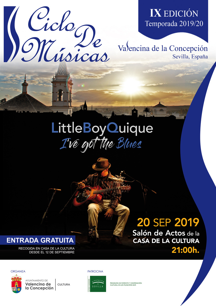 El próximo viernes 20 de septiembre, a las 21:00 horas, en el Salón de Actos de la Casa de la Cultura de Valencina, se estrenará el IX Ciclo de Músicas de Valencina, con la participación del artista sevillano LITTLE BOY QUIQUE y su ultimo trabajo "I´ve got the blues".