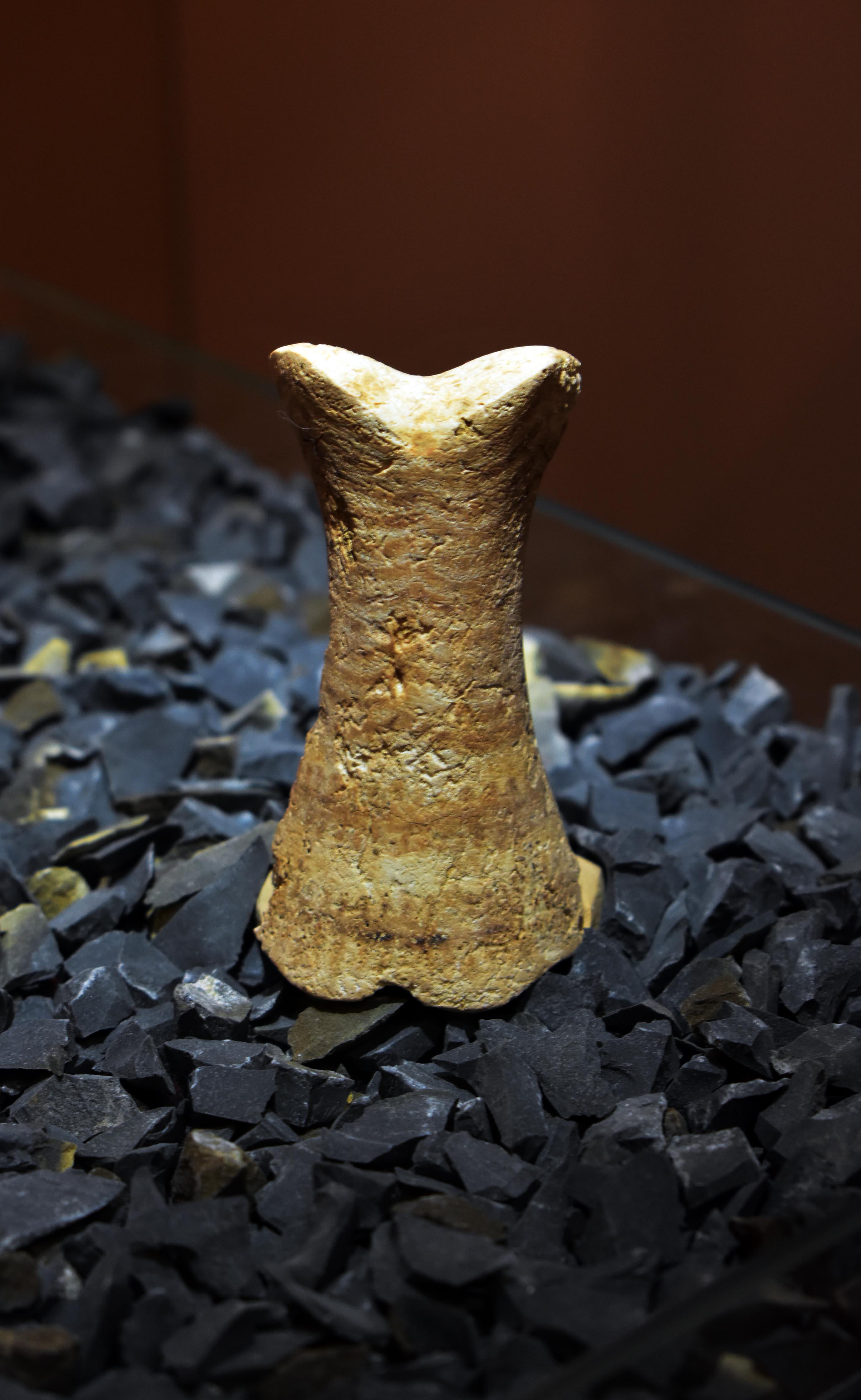 Aunque son numerosas las evidencias de estas representaciones en nuestro yacimiento, destaca esta pieza por su delicado tratamiento y decoración. Elaborada sobre una falange de caballo, su forma natural se asemeja a una figura humana,