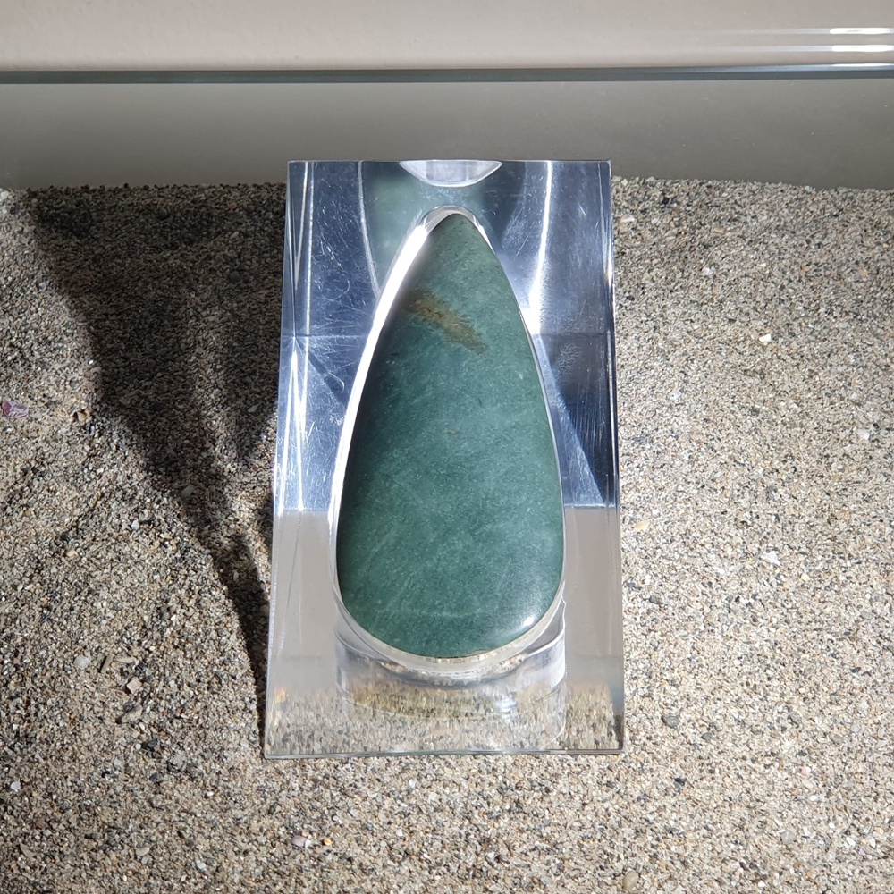 El primero es su materia prima, una piedra semipreciosa, el jade que según los estudios científicos realizados procedería de la zona de los Alpes suizos. No podemos determinar si la pieza manufacturada se trajo desde tan remoto lugar, o bien si, como parece más probable, se transportó a la Península Ibérica la roca matriz y con posterioridad se talló la pieza que nos ocupa y probablemente otros objetos, pues realmente lo frecuente es que esta materia prima se utilizara para la elaboración de elementos más pequeños, como por ejemplo cuentas de collar. Ello mismo enfatiza la singularidad de nuestra hacha.
